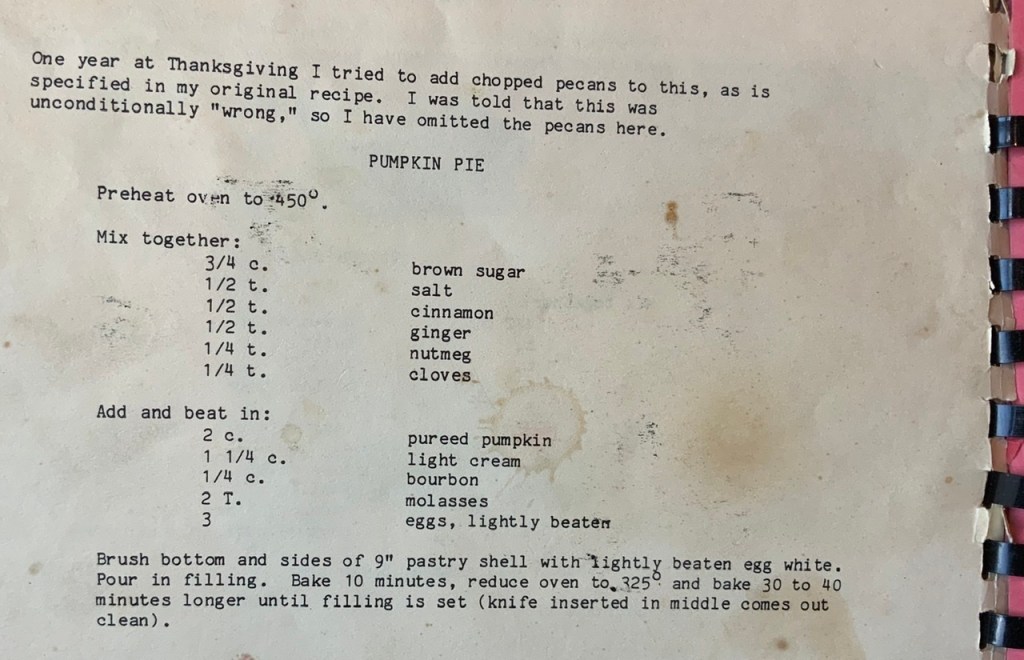 – originally from the New York Times, and an inspiration for developing the family cookbook as she became tired of frequent calls for recipes. As she writes in 1986 in the introduction to the family cookbook “The beginnings of this book lie in the many phone calls I’ve received in the past few years, such as a recent one, collect from Oberlin, Ohio: “Can you give me the pumpkin pie recipe?”